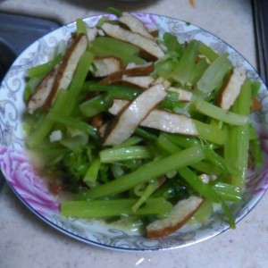 等锅里水烧干,加油进锅中,把油烧开,加葱,过几秒,加芹菜,炒几分钟,加水蒙一下,烧透了,加香干,炒一炒