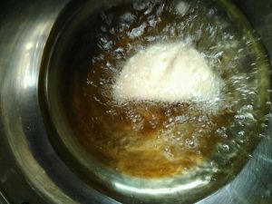 等油热后,放入锅中,用中火炸至金黄(炸的过程中隔一会儿就翻一下面)
