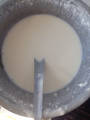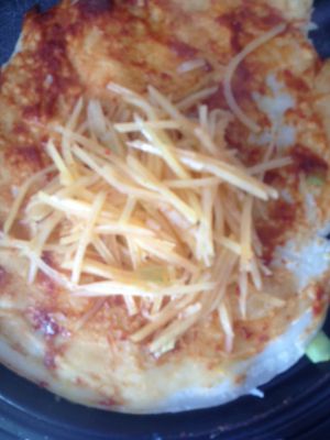 开始放煎饼了,少放油放入面糊铲子铺平,一面放鸡蛋,另一面刷上辣椒酱在放土豆丝,~土豆丝是用热水焯一下放入佐料!我放的就是简单的醋,辣酱,依你自己哦,~