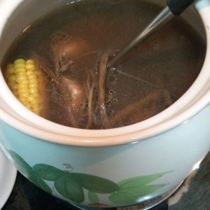 茶树菇泡发,减去根部。汤煮40分钟后放入茶树菇和玉米,继续煮40分钟。