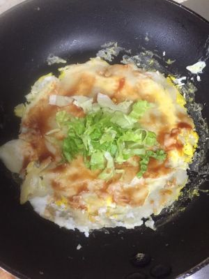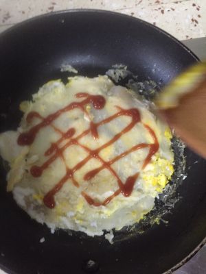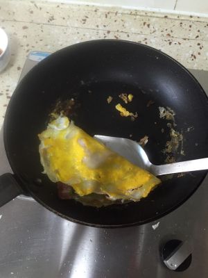 然后对折好蛋饼,加入的东西尽量不要太多,因为太多了不好对折哈