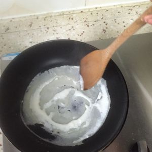 倒入橄榄油,用厨房餐巾纸把油均匀抹在平底锅上.用汤勺舀一勺,用木勺抹平,尽量薄一点.这个步骤我反正失败了很多次,所以建议大家面粉多弄一点