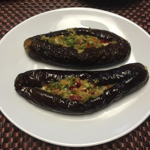 取出烤盘,把料汁用小勺从刀口处加入茄子里,再送入烤箱,烘烤12分钟,大功告成。
