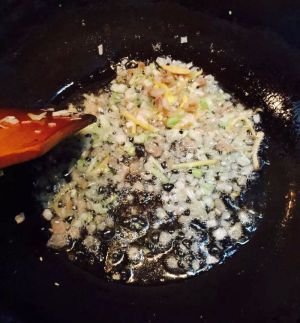 架起油锅,生姜,大蒜末,葱全部放进去一起炒,炒出香味后放腊肉,火不要太大,把腊肉炒的透明油释放出一些后再放辣椒,豆瓣酱,老抽,糖(少量)等调料,我没有放盐,因为豆瓣和腊肉都是咸的。最后加入鸡蛋,翻炒均匀,出锅