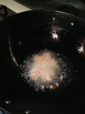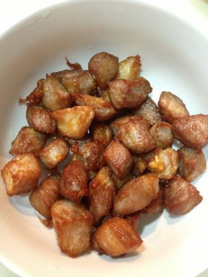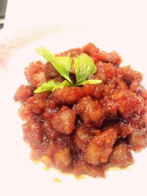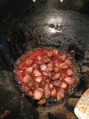 番茄酱(自制)炒热后倒入金黄瘦肉粒 混合翻炒片刻 收汁出锅啦 米饭准备足量喔
