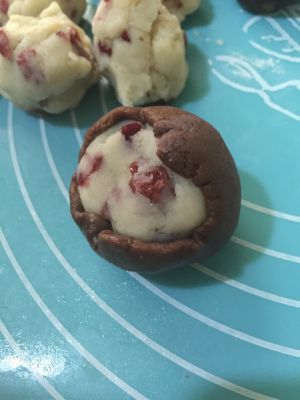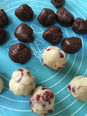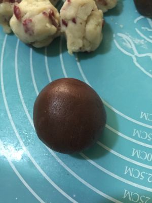 把饼皮分成20克一个的小团,蔓越莓莲蓉馅分成30克一个
