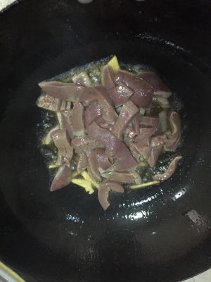 爆炒姜片后,放入洗好的猪腰,炒至变色