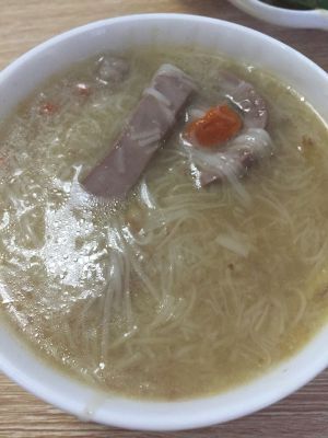 猪腰煮熟后,掀开锅盖,放入面线。加适量盐巴调味。滚几下,面线易熟,起锅。