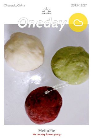 分别加入红曲粉、抹茶粉。