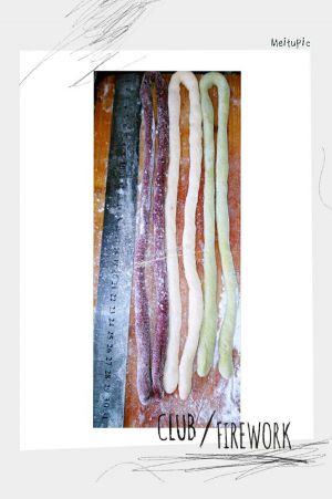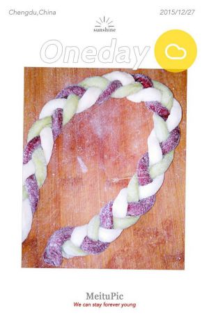 取其中一组,用编3股辫的方法编起来(左右两边的面条轮流往中间放),最后两头相接,捏紧。