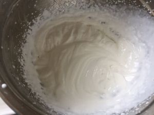 在两个蛋清中加入少许柠檬汁,用电动打蛋器打发蛋清,分三次加入20g白糖,蛋清打至干性发泡,即提起打蛋器有坚挺的角,蛋白倒扣不滴落。