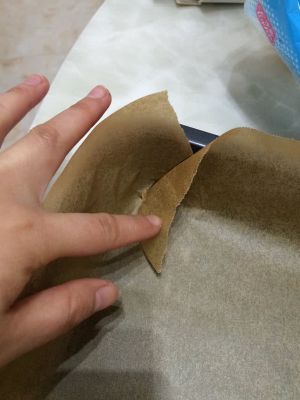 接着我用普通的八寸方模,正好可以摆下四个四寸的圆。(如果没有,完全可以用锡纸做一个模具)。方模里放入一张油纸,四个角剪一刀,油纸就可以放得下了。