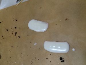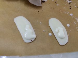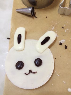 两片耳朵成型后从油纸上取下来,用小刀把不平整的边缘轻轻刻平整。再在两片耳朵后挤上软的白巧克力。