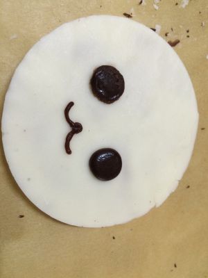 等白巧克力凝固,翻面,将平的一面朝上。在裱花袋中放入黑巧克力,隔水融化后,在白巧克力圆片上点上眼、鼻子和嘴巴。