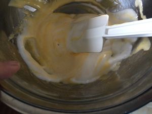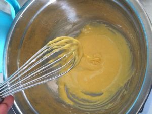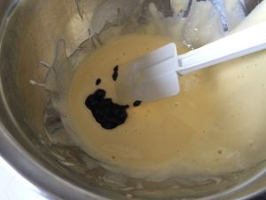 取三分之一打发好的蛋白与蛋黄面糊,翻拌均匀,再取三分之一翻拌。分三次将蛋白完全加入。手法要快,不能画圈,翻拌一定要均匀,动作太温柔会让蛋白蛋黄面糊分离。