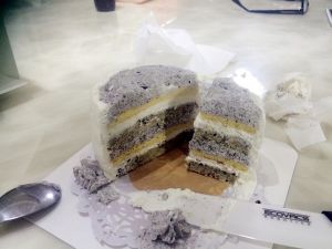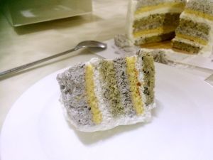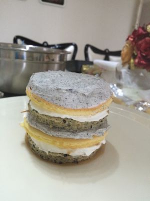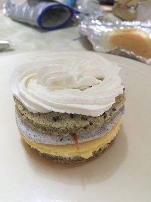 最后放一层戚风蛋糕胚,在顶端挤一层黑芝麻奶油,抹平。就这样完成八层组合!