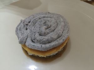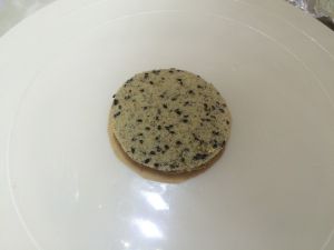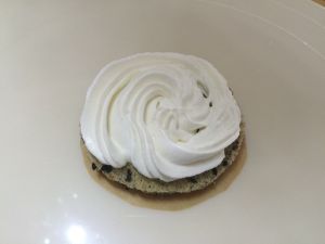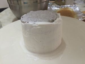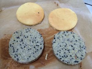 再放一片黑芝麻戚风蛋糕胚,再挤一层白奶油抹平。
