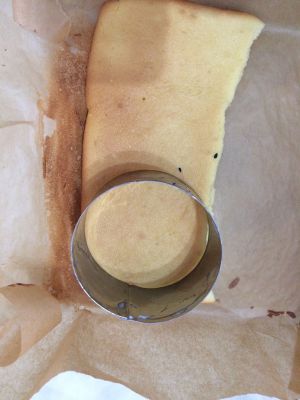 取出2块蛋糕胚,用四寸的慕斯圈,压出四块圆形的戚风蛋糕胚。