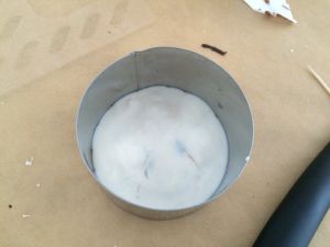 最后做表面装饰:铺一张油纸,在四寸慕斯模中倒入隔水融化的白巧克力。