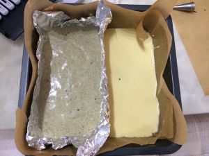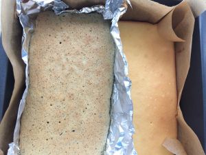 我用锡纸做了个八寸方模的一半大小的模具,左边倒入黑芝麻戚风蛋糕面糊,右边是普通的戚风蛋糕面糊。震一下模具,震出面糊中的大气泡。把剩下的5g芝麻均匀地洒在黑芝麻戚风蛋糕面糊表面。