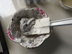 用同样方法挤上一圈黑芝麻奶油,用刮刀抹匀。