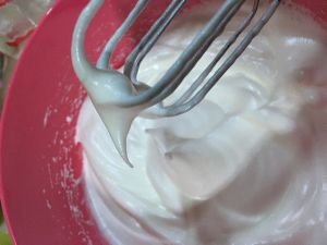 11、直到打到湿性发泡,提起打蛋器,会出现一个尖角稍微向下弯