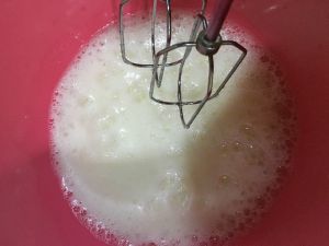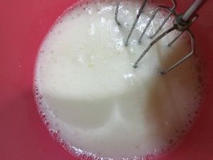 8、用电动打蛋器将蛋白打成粗点的泡泡,此时加入三分之一的糖,继续打