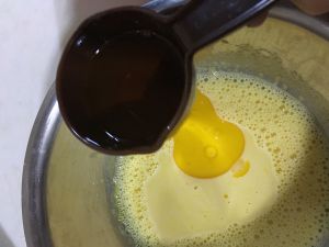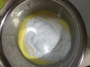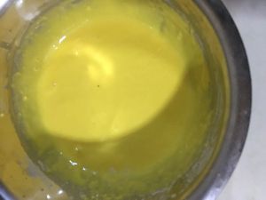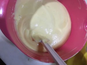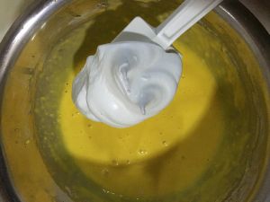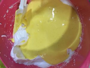 13、翻拌好的蛋黄糊倒入蛋白盆中,继续用刚才的方法拌匀