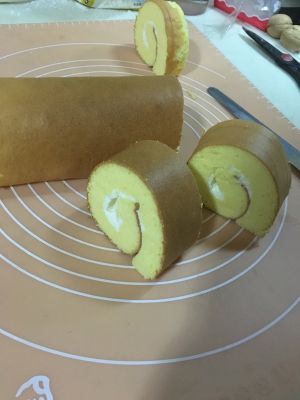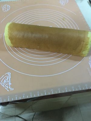 19、用擀面杖擀着油纸往前卷,卷完用油纸放在冰箱冷冻室定型五到十分钟取出