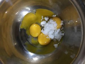 2、制作蛋黄糊、先把蛋黄和蛋清分离,然后放入20g的白砂糖,搅拌至糖溶解