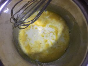 12、挖一勺蛋白在蛋黄盆中,翻拌均匀或切拌,切记一定不要画圈,否则会消泡