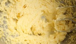 将黄油切成小丁,室温软化,将黄油打滑,加入150g糖,继续打发至黄油体积变大颜色变浅。