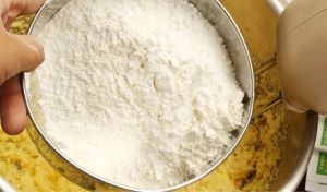 将低筋粉和泡打粉混合,用面粉筛筛入面糊中。