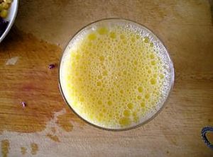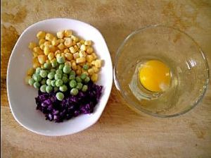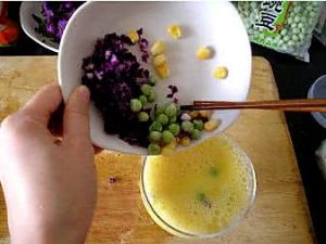 放入适当盐,把玉米粒、青豆、紫橄榄倒入鸡蛋中,搅匀。