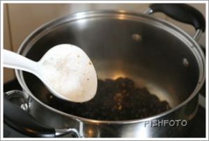 黑豆倒入锅里,加水至稍没过黑豆,再倒入生抽;