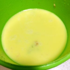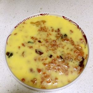 鸡蛋打到碗里,加入水打发均匀,水的份量跟平时蒸鸡蛋时差不多。