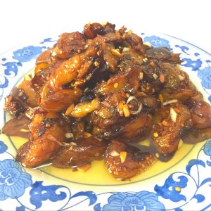 翻炒至茄子软榻微焦 放入葱姜和蒜末 再放入老抽鸡精炒匀