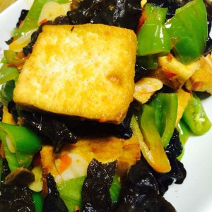 锅内倒少量油,放入蒜片,倒入郫县豆瓣酱,小火炒香,倒入青椒、木耳、西红柿翻炒,断生后倒入一点点水,放入豆腐,翻炒给豆腐上味儿,略停下入味,关火盛盘。