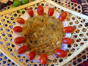 土豆切丝,放盐和少量淀粉,小香葱抓匀。