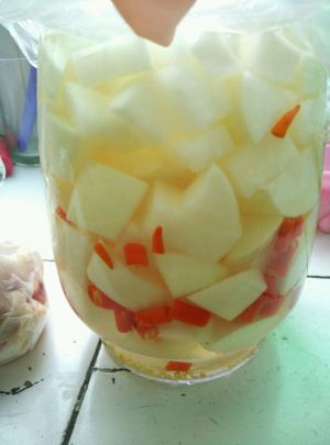 将萝卜块放入罐中,盖好盖子,放在阴凉处,两天后就可以吃了