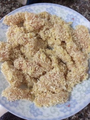 将腌制好的鸡胸肉放到鸡蛋糊里,再放到面包糠里,均匀的裹上面包糠,放入盘内备用