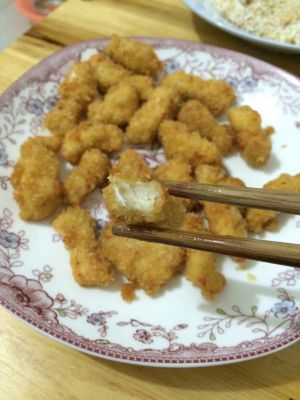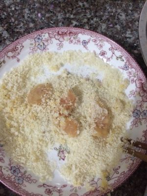 油烧到开始冒泡,将半成品放入锅内,记得搅拌一下,防止粘合在一起。关小火,炸2-3分钟,呈金黄色即可,时间不宜过长,鸡肉会变柴。
