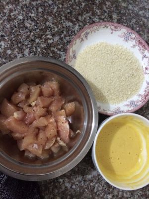 鸡胸肉切成小块,放盐、孜然粉、黑胡椒腌制20分钟左右。期间将鸡蛋面粉搅拌均匀。准备好面包糠。