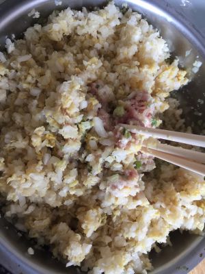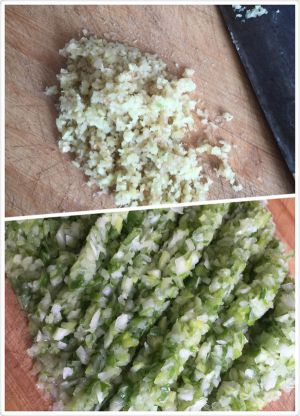葱、姜切末备用。五花肉剁碎,忘记拍照片了,哈哈。