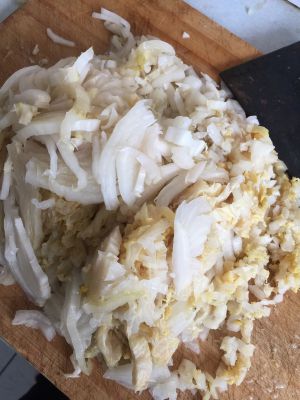 酸菜用水冲洗几遍,有条件的可以泡上1小时左右,个人感觉泡过后酸菜味不够浓。把酸菜里的水挤压掉,剁成小丁。