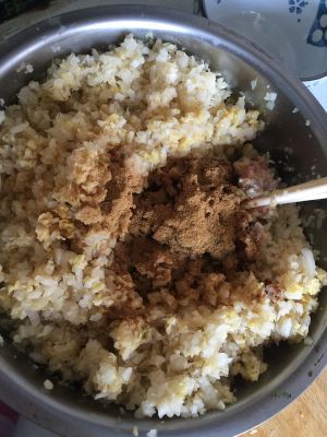 陆续放入老抽、蚝油、香油、五香粉、盐,顺时针搅拌5分钟左右。(肉馅出香代表盐调味刚刚好哦)