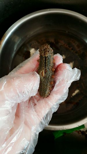 泡好的海参用剪子顺着肚子下面的口剪到头,去掉沙嘴,就是像小胡子的地方。外面卖的海参为了让海参发的更大一般都把肚子下都剪开,里面的筋剪断,自家吃我就没那么剪,海参发的越大,口感就不那么好了,我还是喜欢吃带点嚼劲的
