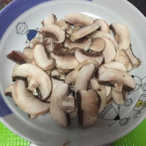 口蘑切片备用(菌类食物洗干净后撒点盐用来水泡一会去有害物质)
