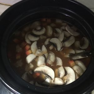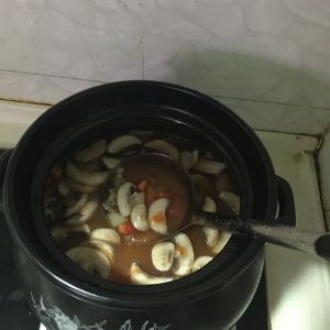 第五步,把刚才制作好的西红柿酱汁材料和口蘑放入砂锅内加水大火烧开然后转小火慢慢熬。