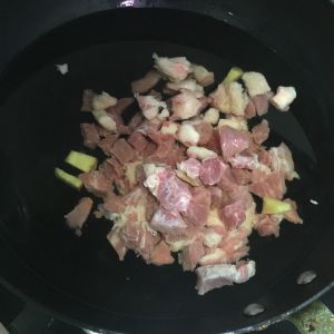 第一步,锅里放水、姜片、料酒、牛肉冷水下锅去血水。